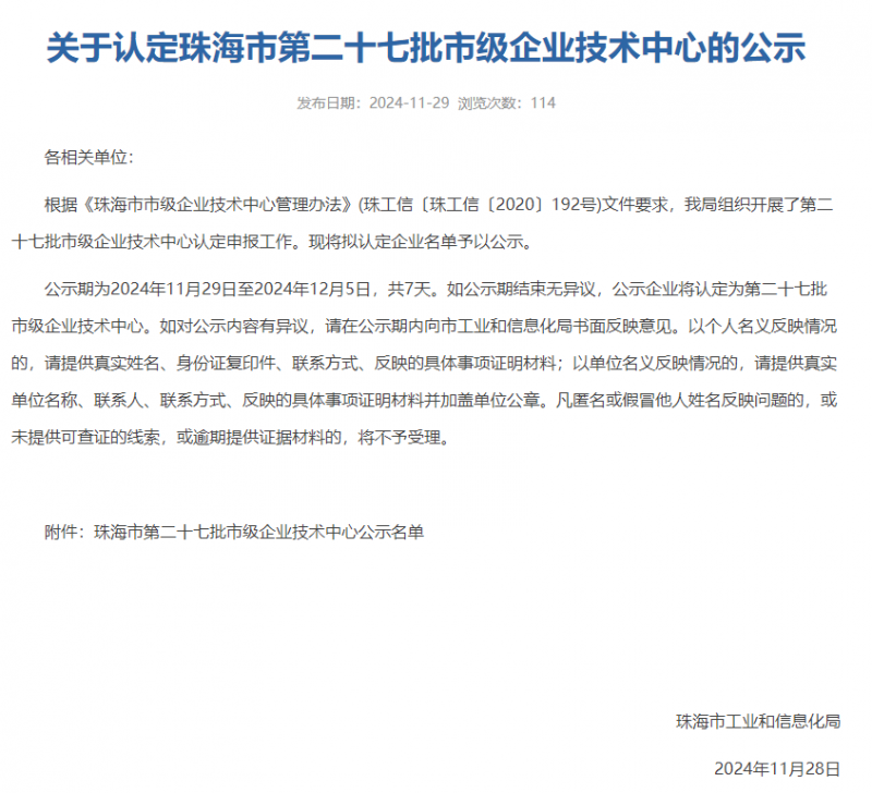 2024年11月29日,珠海市工業(yè)和信息化局發(fā)布了《關于認定珠海市第二十七批市級企業(yè)技術中心的公示》,廣東泰坦智能動力有限公司成功入選“珠海市第二十七批市級企業(yè)技術中心”,此次入選不僅是對公司過去努力的肯定,更是對未來發(fā)展的期許。