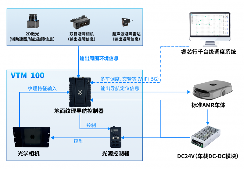 VTM 100(Visual Texture Module)是睿芯行推出的基于視覺的地面紋理導(dǎo)航模組。該模組由光學(xué)相機和地面紋理導(dǎo)航控制器組成,通過光學(xué)相機輸出地面紋理特征,搭配地面紋理導(dǎo)航控制器產(chǎn)品實現(xiàn)無需地面任何標識物,輸出定位信息。可支持瓷磚、水泥、金剛砂等材質(zhì)地面,實現(xiàn)基于視覺地面紋理的導(dǎo)航定位。VTM100是標準化模組,可基于客制多款A(yù)MR標準車型,快速形成地面紋理導(dǎo)航AMR整車產(chǎn)品,可支持最高速度2m/s,定位精度±5mm,場景無憂,無懼白天黑夜。