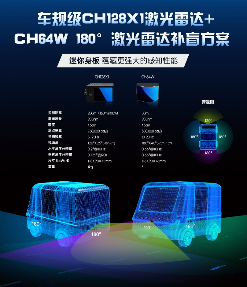 鐳神智能自主創新和尋求突破的步伐從未停止,于2021年先后推出車規級的CH128X1 128線混合固態激光雷達和補盲神器CH64W超大視場角混合固態激光雷達,迷你身板,蘊藏更強大的遠程探測和感知性能。