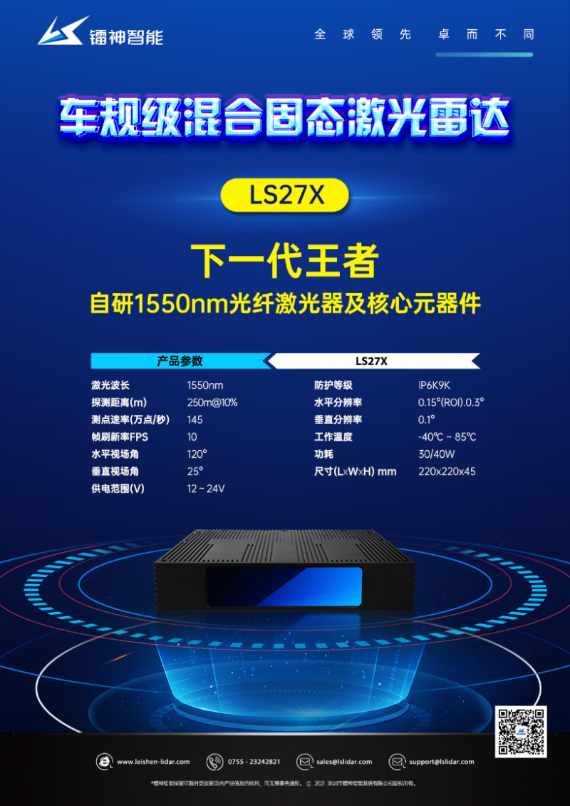 采用自研的1550nm光纖激光器和核心元器件的下一代王者——LS27X車規級混合固態激光雷達即將面世!