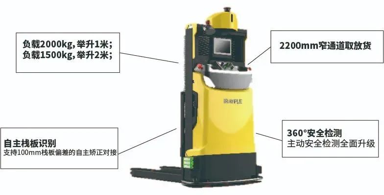 華睿科技推出F150A系列窄通道叉取型AMR。F150A系列叉取型AMR基于窄體車身設計,可以在2200mm通道內將最大2000kg貨物堆高1米,滿足窄通道內的大負載搬運和機臺對接作業。也可以將1500kg貨物堆高至2米,滿足貨物的轉運和上架存儲。